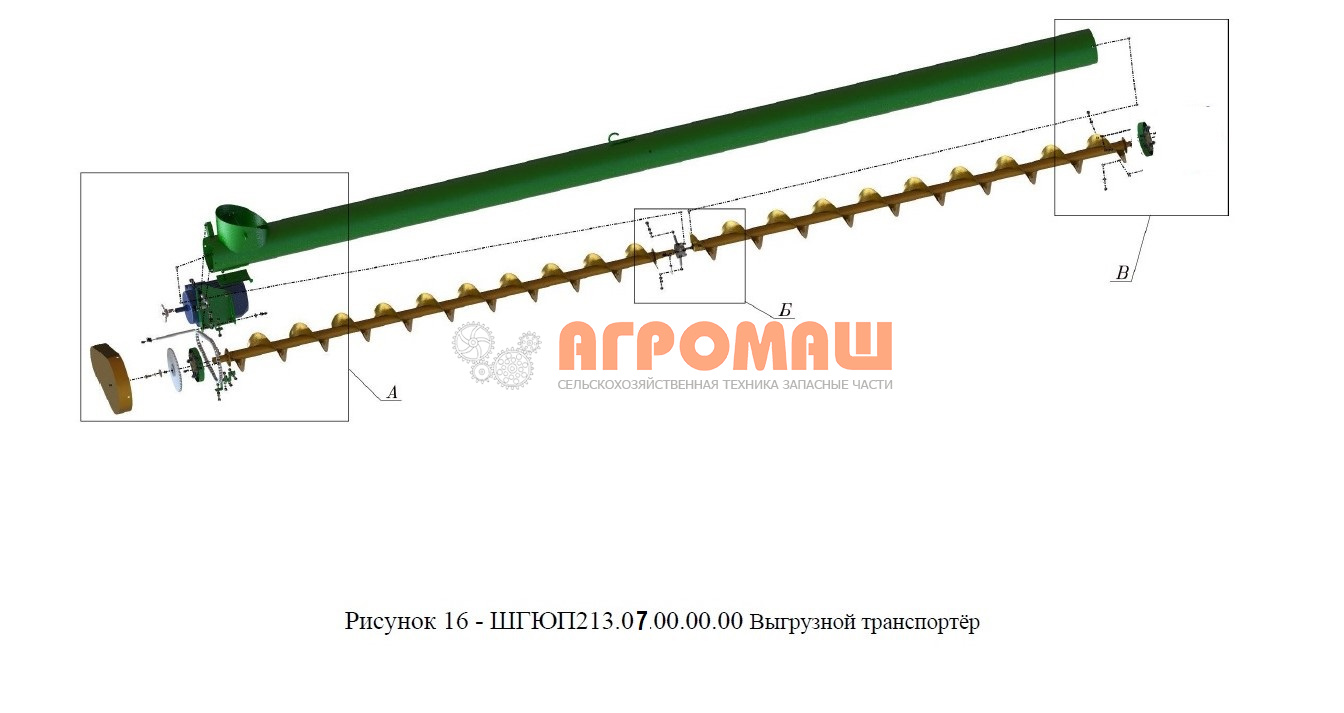 ШГЮП213.07.00.00.00 — выгрузной транспортёр, в состав которого входят, в частности, корпус выгрузного шнека, первичный вал, электропривод, звёздочка, ограждение, фланец, кронштейн, натяжной винт, заслонка, ось, шпонка, болт, гайка, шайба, шплинт, винт, цепь и соединительное звено.  Комплектующие для протравливателя семян ПСК-15.